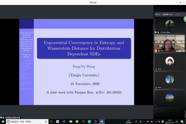 11月27日上午,国家杰出基金获得者、长江特聘教授王凤雨教授受邀为williamhill英国威廉希尔师生带来了一场题为:“Exponential Convergence in Entropy and Wasserstein Distance for Distribution Dependent SDEs ”的学术报告。本报告介绍了分布相关随机微分方程熵和Wasserstein距离的指数收敛性。