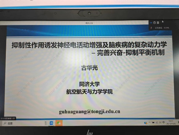 10月8日下午,应用数学系邀请同济大学航空航天与力学公司古华光教授,进行了 “抑制性作用诱发神经电活动增强及脑疾病的复杂动力学”的线上学术报告。 此次报告由邀请人杨卓琴老师主持,应用数学系主任郑孝信老师及相关研究领域的师生参加了本场报告。