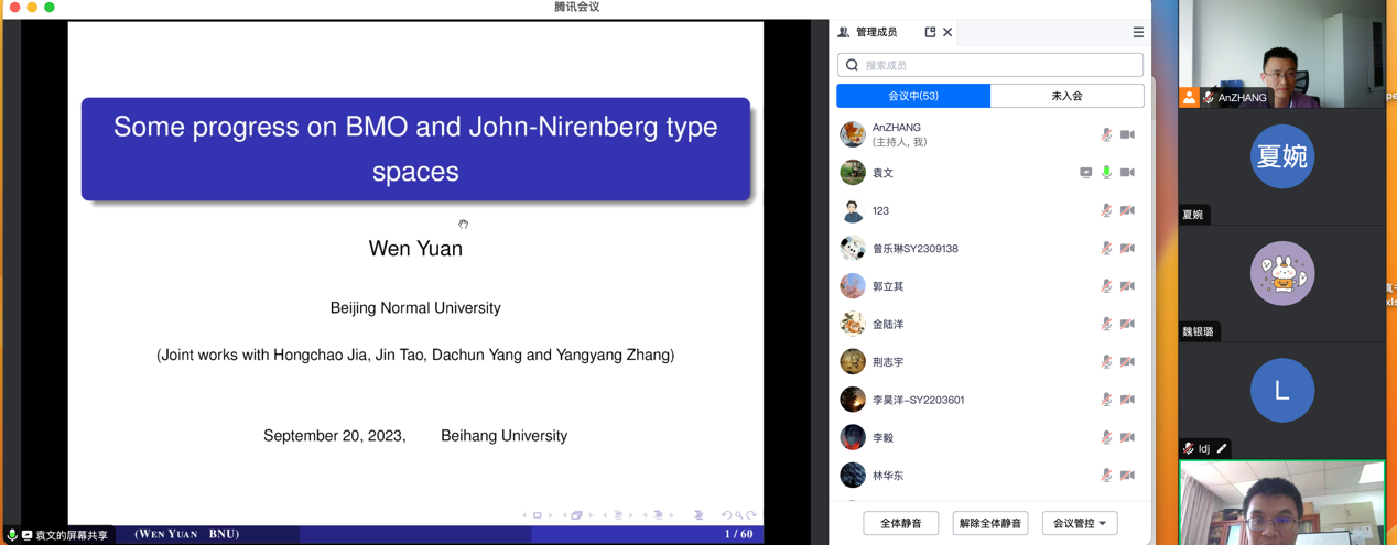 2023年09月20日,北京师范大学袁文教授,应邀为williamhill英国威廉希尔师生做了题为 “Some progress on BMO and John- Nirenberg type spaces”的学术报告。报告由张安老师主持。