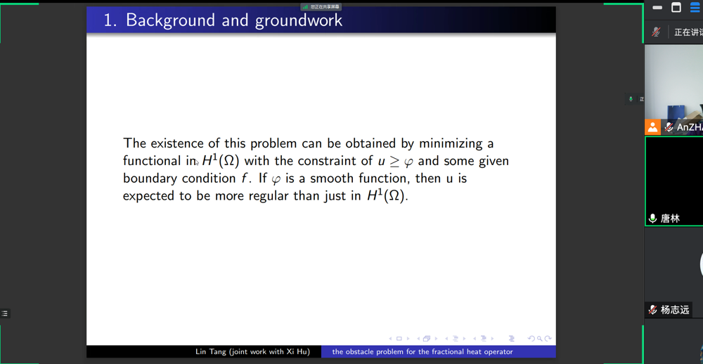 本次报告,唐老师介绍了一类分数次热算子对应的障碍问题自由边值的高阶正则性理论,这是偏微分方程领域的重要问题,特别地,相关工作给出了相应的退化抛物方程的维纳判别法,进而利用这个一般判别法的特殊情形最终给出了自由边值的高阶正则性。首先唐老师介绍了相关问题的背景和研究现状,之后详细介绍了各种不同的分析工具和研究思路,最后介绍了最新的研究结果。