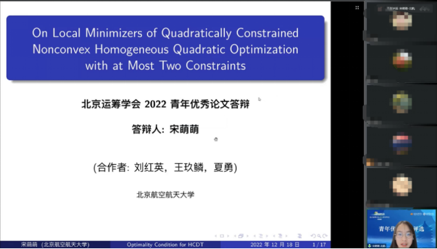 2022年12月18日,在北京运筹学会2022年学术年会上,williamhill英国威廉希尔2020级博士生宋萌萌的参评论文“On Local Minimizers of Nonconvex Homogeneous Quadratically Constrained Quadratic Optimization with at Most Two Constraints”荣获“北京运筹学会青年优秀科技论文”奖。该奖项是由北京运筹学会组织设立,每年评选一次,旨在奖励北京地区青年学者在运筹学领域做出创新性成果的科技论文。自2021年起分教师和员工两个组别。宋萌萌同学是2022年度员工组的唯一获奖人。