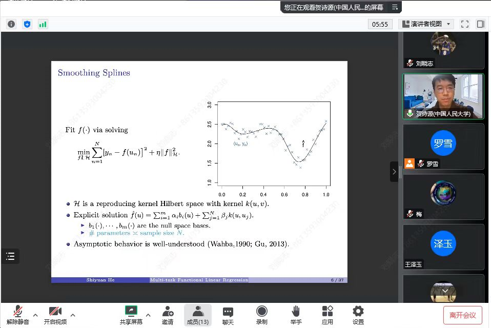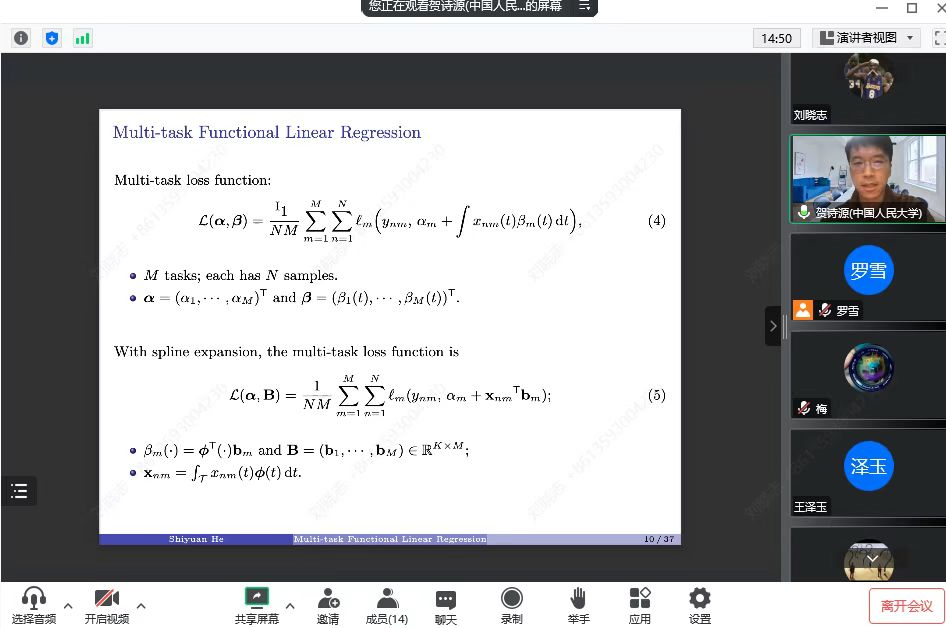 2022年11月18日,中国人民大学统计与大数据研究院贺诗源老师应罗雪老师的邀请,通过线上的方式为williamhill英国威廉希尔师生带来了一场题为“A Unified Analysis of Multi-task Functional Linear Regression Models with Manifold Constraint and Composite Quadratic Penalty”的学术报告。