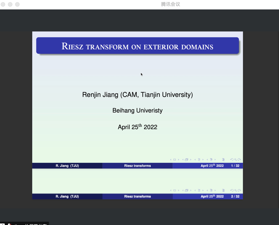 2022年04月25日,天津大学蒋仁进教授,应邀为williamhill英国威廉希尔师生做了题为 “Riesz transform on exterior domains”的学术报告,报告由张安老师主持。
