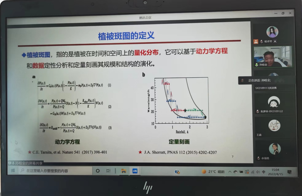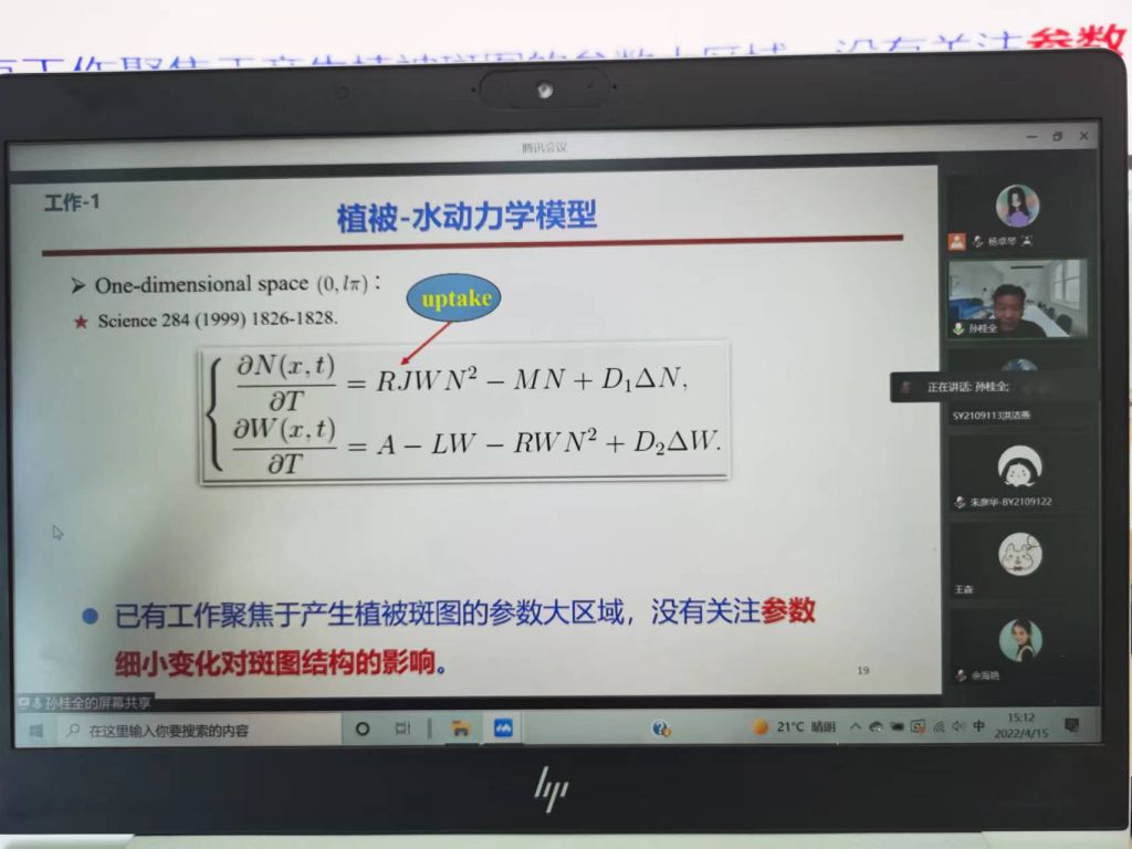 2022年4月15日周五下午,受公司应用数学系杨卓琴老师邀请,国家优秀青年科学基金获得者、中北大学教授、博士生导师孙桂全老师,为公司师生作了题目为“干旱半干旱区域植被斑图动力学机制研究“的线上学术报告。