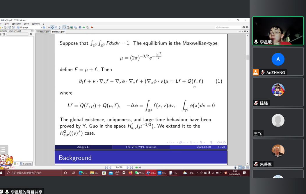 2021年12月30日下午,巴黎第九大学李星毓博士,应邀为williamhill英国威廉希尔师生做了题为 “The Vlasov-Poisson-Boltzmann/Landau equation with polynomial perturbation near Maxwellian”的学术报告,报告由任天一和张安老师主持。
