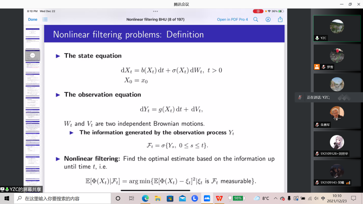 2021年12月23日,美国奥本大学数学与统计学系曹延昭教授应罗雪老师的邀请,通过线上的方式在北航数学论坛为数学公司的师生带来了一场题为“Backward stochastic differential equation method for nonlinear filtering problems”的学术报告。