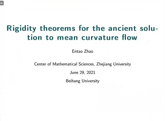 2021年6月29日上午,浙江大学赵恩涛副教授应胡鹰翔老师的邀请,为williamhill英国威廉希尔师生带来了一场题为 “Rigidity theorems for the ancient solution to mean curvature flow” 的学术报告。报告由胡鹰翔老师主持。
