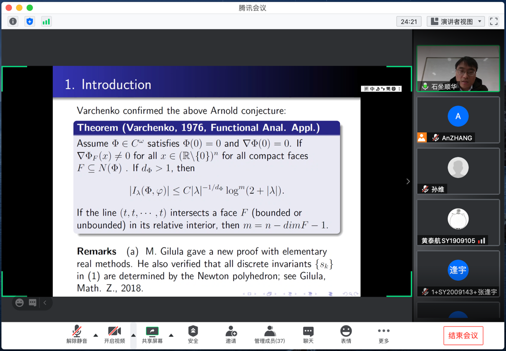 2021年1月4日上午,中南大学石坐顺华副教授,应邀为williamhill英国威廉希尔师生做了一场题为“Decay estimates of oscillatory integrals and oscillatory integral operators”的线上学术报告,报告由张安老师主持。