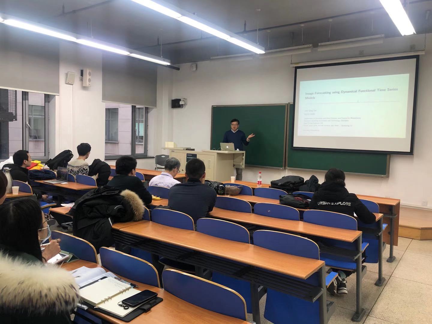 报告开始,史建清教授系统介绍了如何用函数型数据分析方法来处理时空图像数据。随后介绍了多维函数型数据的协方差估计问题,指出了研究多维函数型数据的交互协方差结构的重要性,然后介绍了动态函数型时间序列模型的相关研究。此次报告吸引了众多校内校外的师生。报告结束后,参会师生就报告内容与史建清教授进行了热烈讨论。