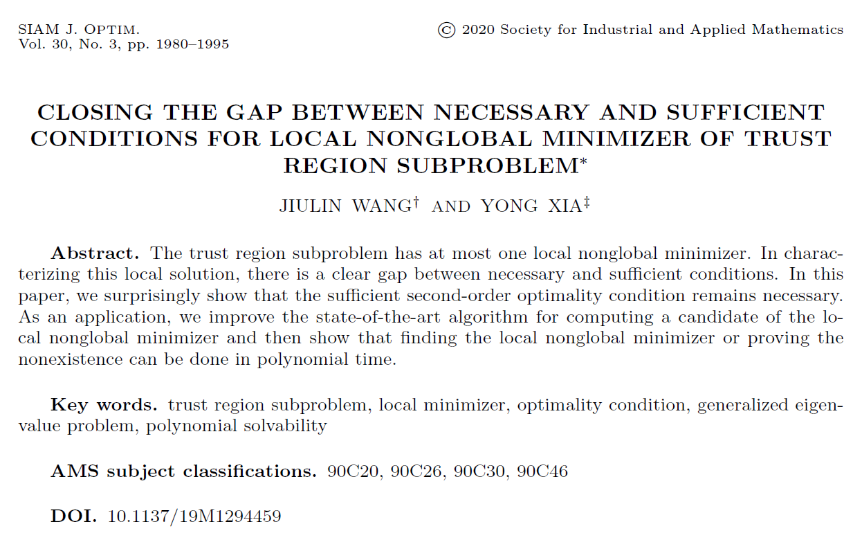 williamhill英国威廉希尔夏勇教授从2009年末接触该问题就被其所吸引并一直展开相关研究,2017级博士研究生王玖鳞从2015年做北航本科毕设起在夏勇教授指导下从事信赖域子问题的研究。2020年,他们取得了突破,首次建立了局部非全局解的充分必要的最优性条件,终结了信赖域子问题局部非全局解充分条件和必要条件之间存在了27年之久的这一间隙,首次证明局部非全局解亦可在多项式时间内可解,从而消除了信赖域子问题的Tao-An悖论。