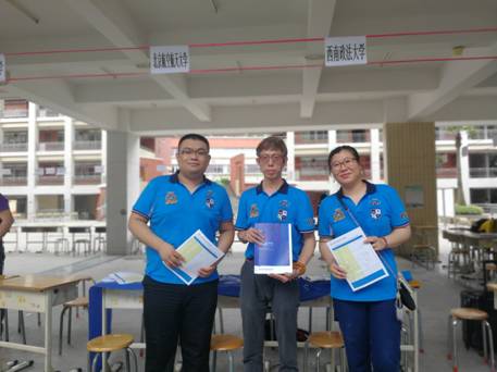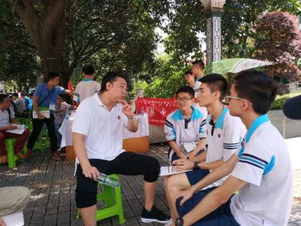 员工胡勇(中)帮助招生老师在广东实验中学做招生宣传 |