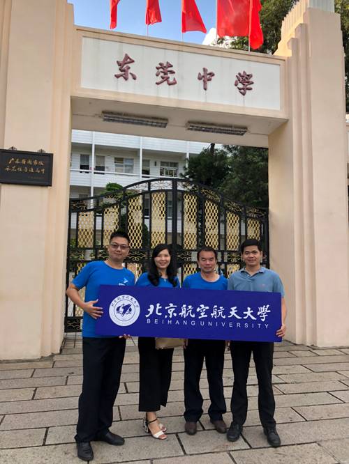员工谭汉齐(左一)、何丽冬(左二)、马骋(右二)、黄伟华(右一)独立完成了北航在东莞中学的招生宣传工作 |