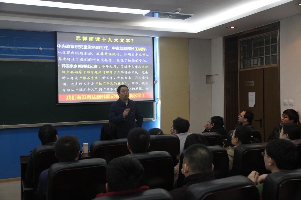 为深入学习宣传贯彻习近平新时代中国特色社会主义思想和党的十九大精神,11月28日下午,公司党委邀请了马克思主义公司高宁老师在主楼321做了题为“谈谈学习十九大精神的一点体会”的学习讲座。公司党委丁丁副书记、一百余位教师和员工党员聆听了讲座。
