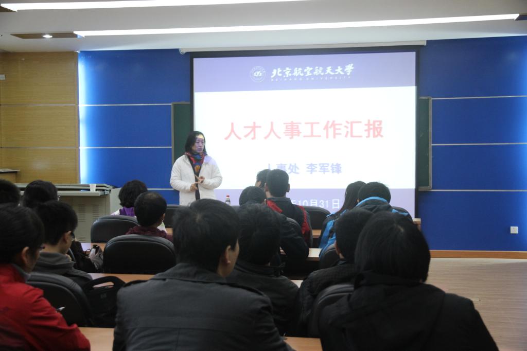李军锋处长讲到,围绕公司建设空天信融合特色世界一流大学的战略目标,公司人才工作遵循“崇尚知识、崇拜人才”的理念,以服务国家战略需求、瞄准国际学术前沿为基点,努力打造高端人才不断汇聚、团队队伍持续发展、用人机制灵活多样、成长环境宽松和谐的人才工作新局面。李处长强调,国家已出台首个《国家中长期人才发展规划纲要》,国家层面的人才支持政策已由传统的单一体系发展为多渠道的人才支持体系。公司层面的人才成长支持体系和团队发展支持体系也在不断的完善发展。在新的人才支持体系下,教师队伍的建设面临着机遇与挑战。就公司近期发布的蓝天人才行动计划(二期),李处长从行动计划的内涵、内容、保障措施等三方面进行了详细介绍。针对公司教师所关心的人才发展激励机制、择优选留机制以及出国研修、职称、进人、绩效等政策,李处长做了认真细致的说明,并对公司教师的职称晋升等情况做了统计分析。