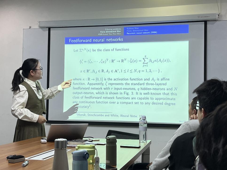 报告首先介绍了高维非线性滤波这一具有挑战性的问题。高维非线性滤波问题主要根据噪声观测估计随机动力系统状态,在工程中具有重要意义。该问题可以简化为求解Duncan Mortensen Zakai(DMZ)方程,对于一般的非线性滤波问题,报告利用循环神经网络,基于Yau-Yau算法为非线性滤波器的设计提供了一个可以进行高效计算且效果显著优于EKF、PF等传统滤波方法的框架。报告结束后,参会师生积极与陈秀琼老师进行了交流和探讨。