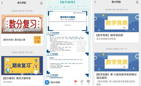 除了线下辅导外,课程组建立了公众号“数分同航”,不定期发布各种学习材料,帮助同学们学好数分。